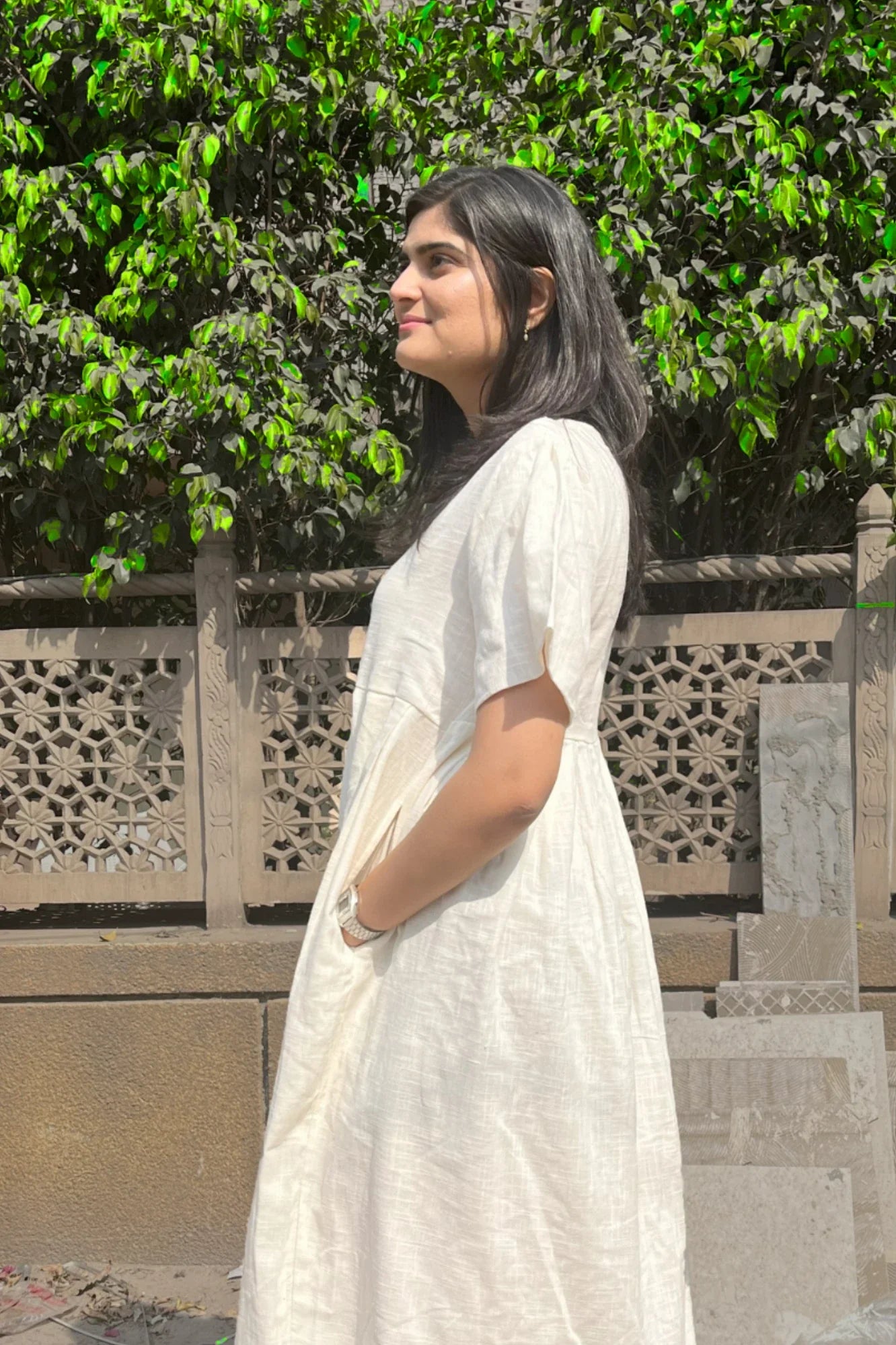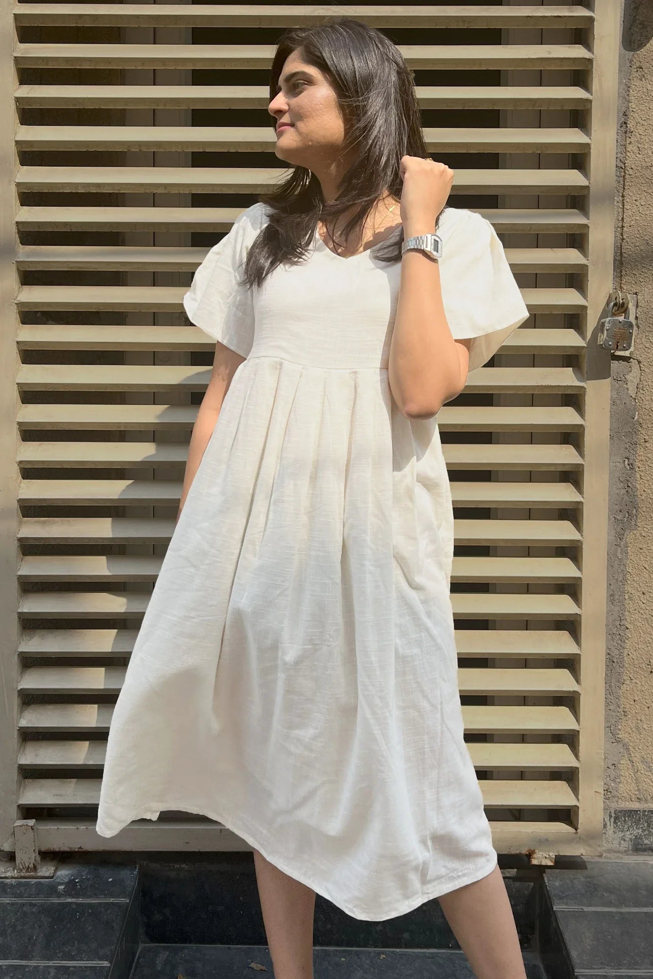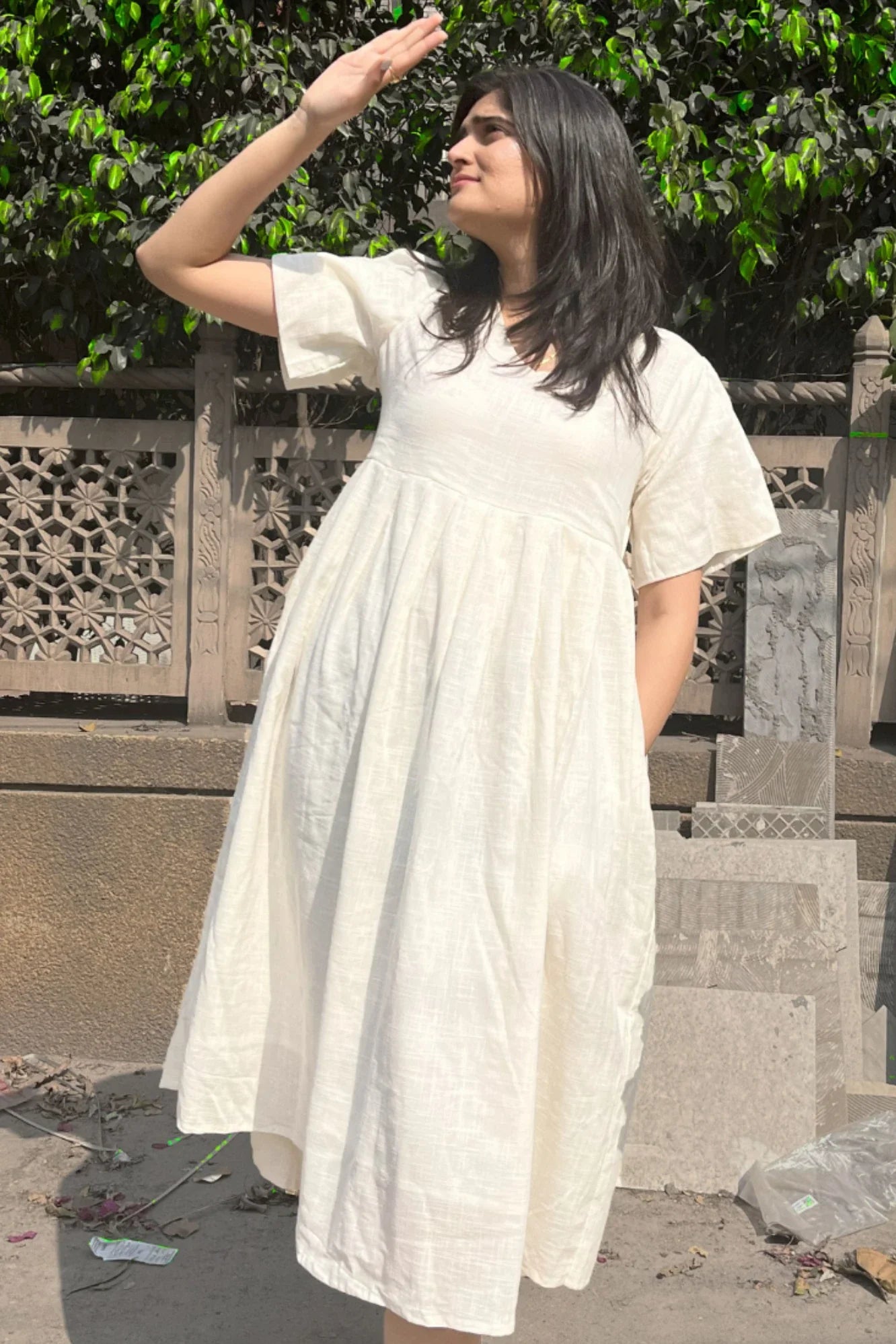 This timeless white dress is a summer staple. Featuring flared sleeves and convenient side pockets, it offers both style and comfort. Perfect for a casual day out or a chic evening event.