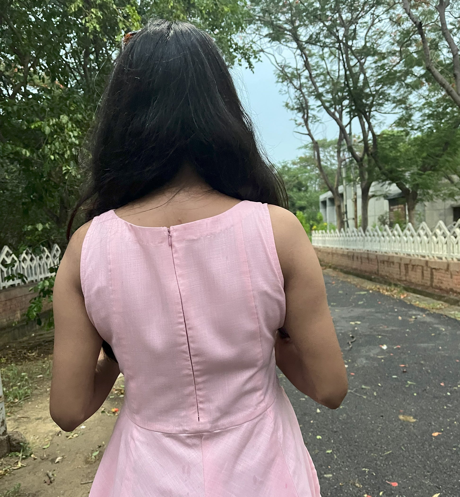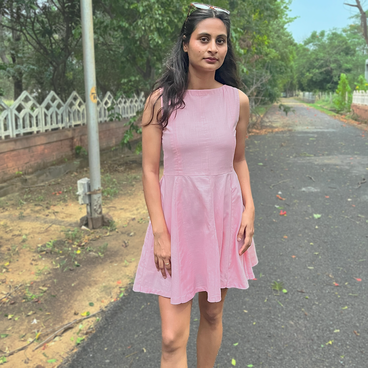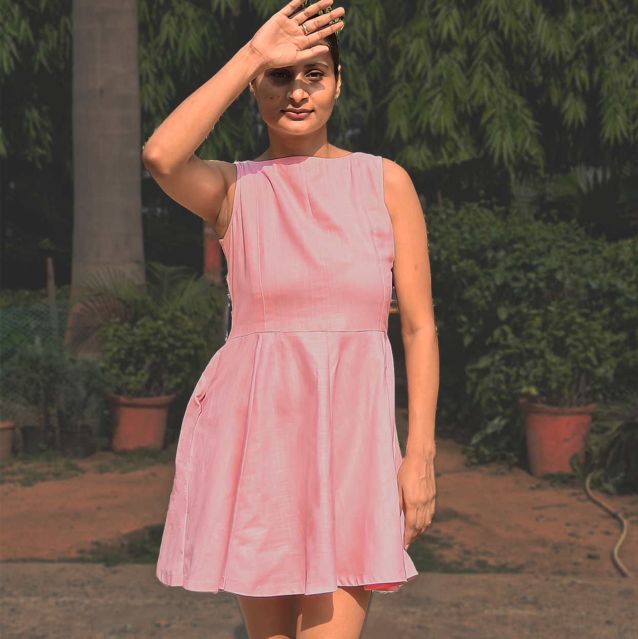 This delightful pink dress is a summer essential crafted from soft, breathable cotton with a smooth lining for added comfort. Featuring a classic fit-and-flare silhouette, it hugs the bodice and flares out at the waist, creating a breezy, feminine shape. The sleeveless design and crew neckline give it a modern, versatile look that’s perfect for warm days. Whether you’re heading out for a brunch date or a casual stroll, this dress offers both style and comfort. Pair it with your favorite sandals or sneakers for an easygoing yet charming ensemble.