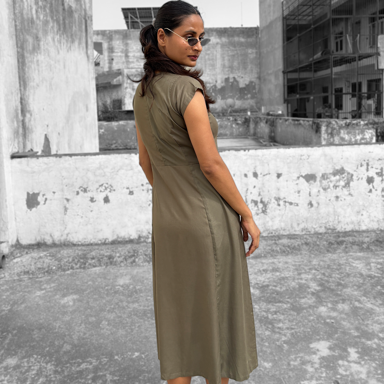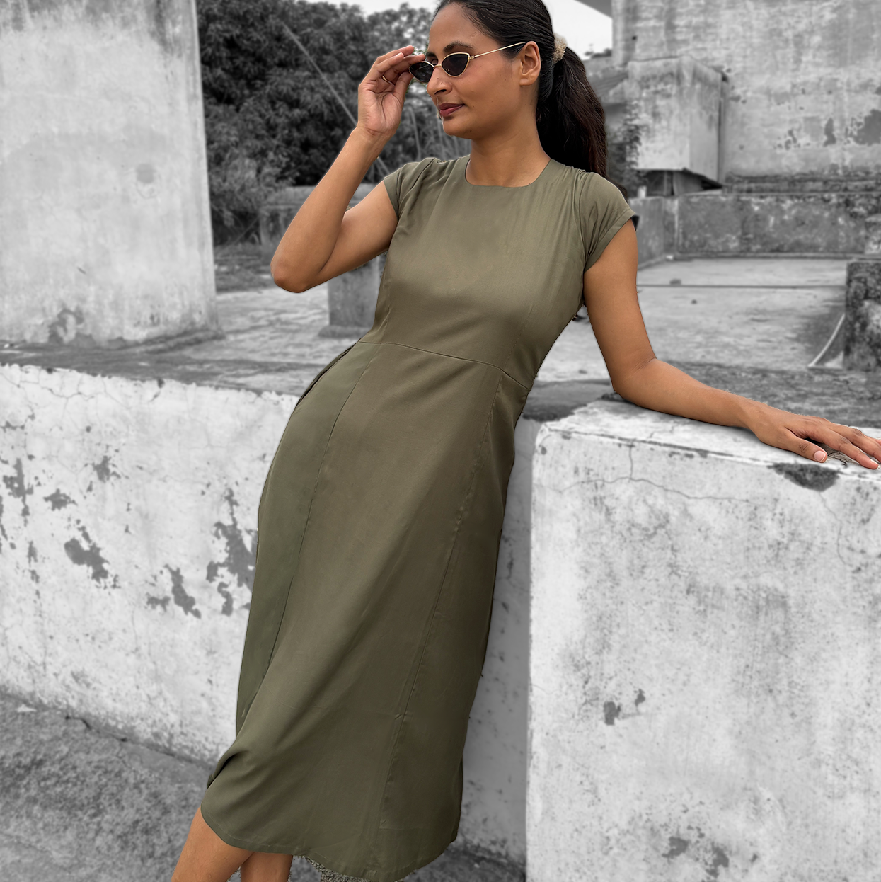 This elegant olive green dress embodies understated sophistication. Crafted from a luxurious cotton-rayon blend, it combines the breathability of cotton with the subtle drape of rayon, creating a fabric that feels soft and comfortable against the skin. The dress features a clean, tailored silhouette that gently skims the body, enhanced by short cap sleeves and a modest round neckline for a refined touch. The midi length adds a timeless appeal, perfect for both casual days and dressier occasions. Effortlessly versatile, this piece can be styled with flats or heels for an effortlessly chic look.