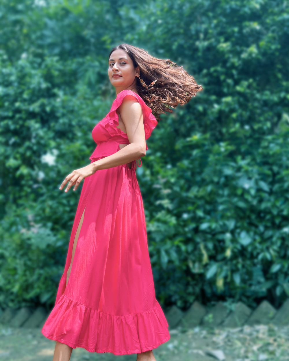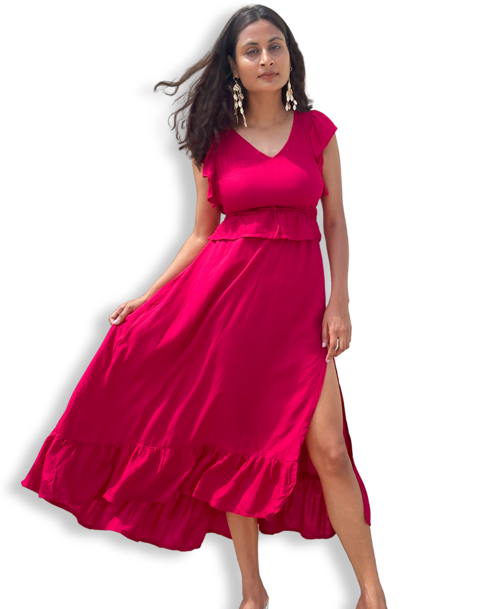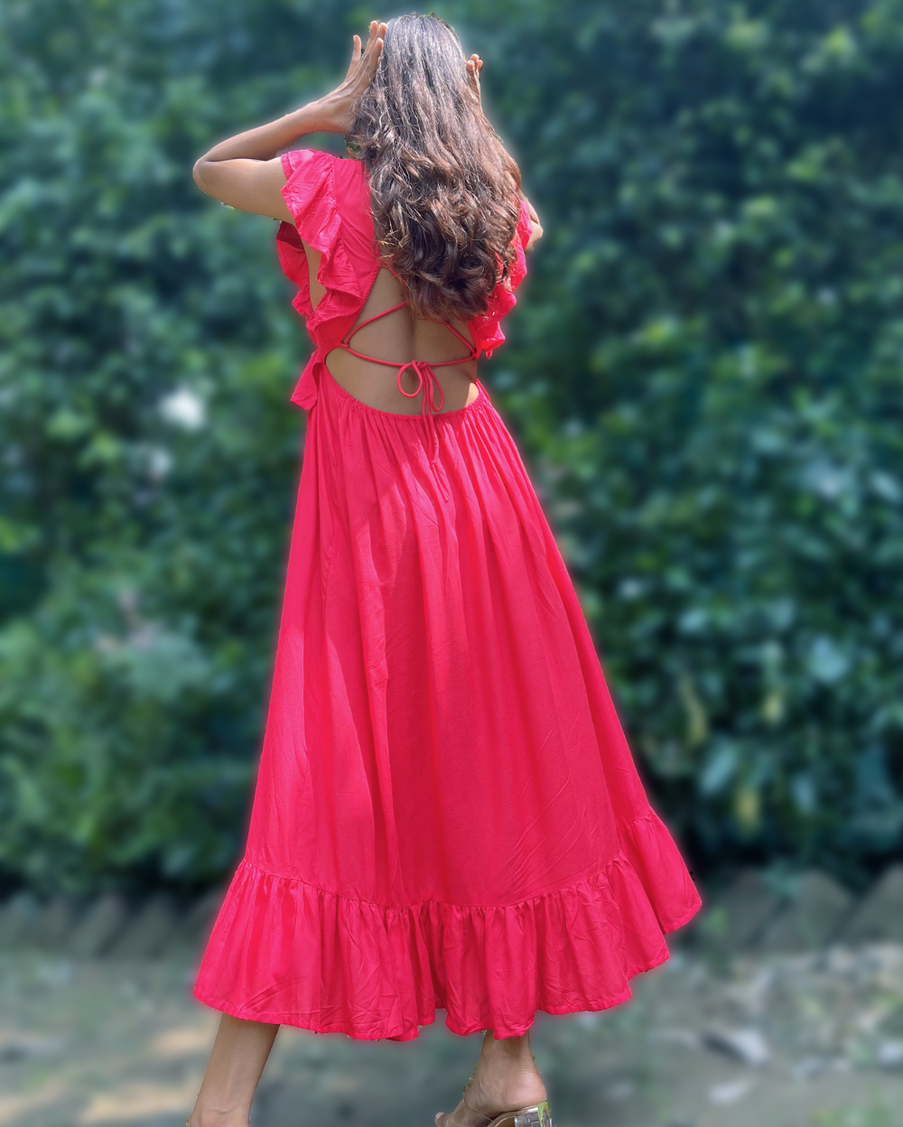 Turn heads and feel your best in this stylish and elegant dress. Made from rich rayon fabric, this dress is incredibly soft and flowy, making it perfect for any occasion. Features a flattering flared design with flared sleeves and flared detailing at the waist. The bright pink color is sure to make you stand out from the crowd, while the beautiful tie detailing at the back adds a touch of sophistication.